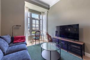 Indoor comforts include hardwood parquet flooring throughout the unit along with heating, guests can enjoy amenities such as an iron with ironing board, clothes drying rack, seating area furnished with a sofa, flat-screen TV, wardrobe closet space, bedside sockets, washing machine, non-feather synthetic pillows, towels and bed linen provided plus availability of baby cot or crib upon request.